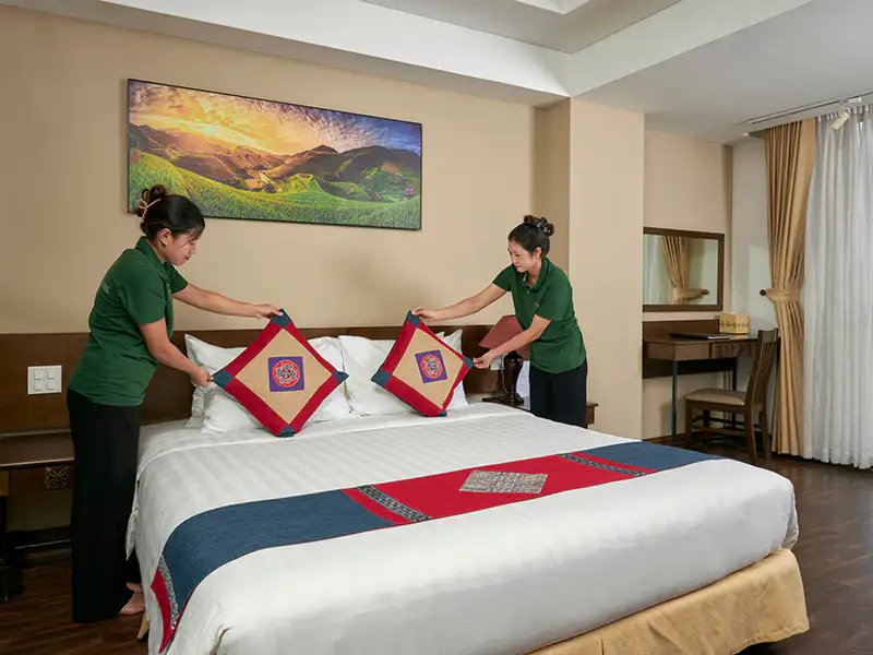 Sapa Elegance is the gold standard for mid-range hotels in Sapa—consistently good across every category. The 45 rooms (25-30 sqm) are modern Vietnamese style with firm beds, good lighting for reading, and heated bathroom floors (essential in winter). Showers have excellent pressure and actually stay hot. Breakfast is the best I’ve had in this price range: fresh pho made to order, Western options that aren’t sad (actual bacon, not spam), local honey, and strong Vietnamese coffee. Staff are genuinely helpful—they arranged my trek, printed my train tickets, and gave honest restaurant recommendations. Location is ideal: quiet side street but 3-minute walk to main square. Free laundry service (huge for trekkers), fast WiFi, and they provide trekking poles on request. This isn’t Instagram-worthy luxury, but it’s reliable, comfortable, and fair value. I trust this hotel.